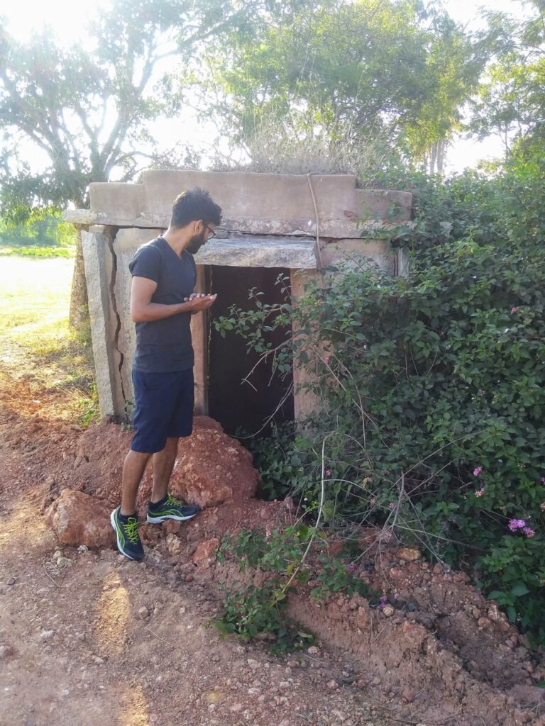 By 4:30 pm, we ventured deeper: across fields, past small stone shelters. One structure caught our curiosity — a stone hut with stairs descending (now overgrown and locked), teasing the possibility of a tunnel or old water conduit. Speculation danced between us — was it once part of some irrigation or village water system? The imagination loves a mystery.