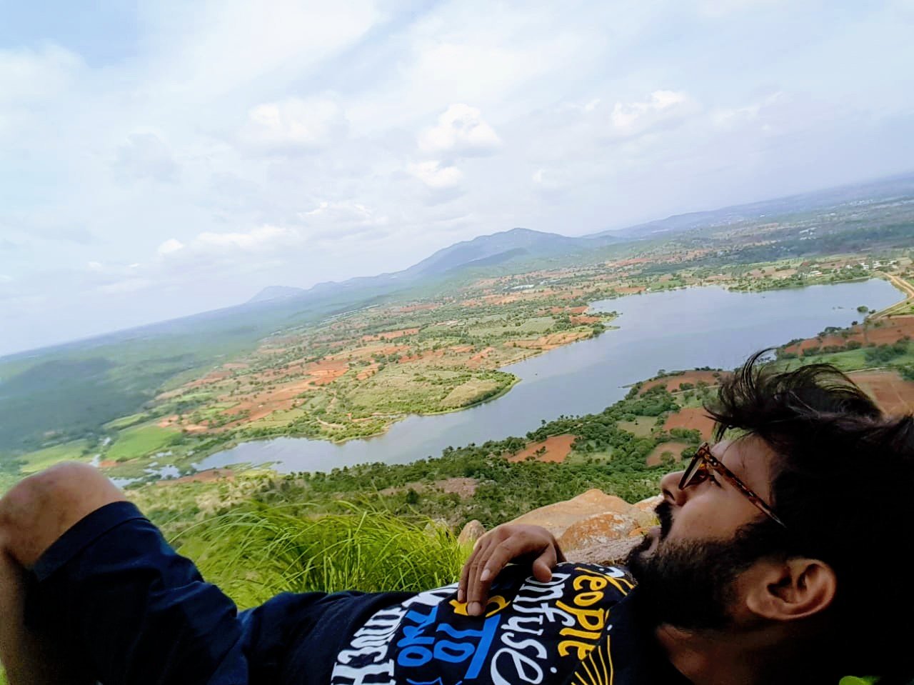 No sun above, strong wind brushing my hair, view of distant hills and lush green landscape, lakes below us, I did very simply feel that I was on top of the world.